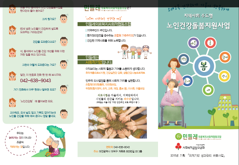 지역사회주도형 노인건강돌봄지원사업 - 공동체 돌봄을 통한 노인 스스로 존엄한 노년의 삶 만들기 사업 브로셔 1탄입니다. 많은 관심 가져주세요~