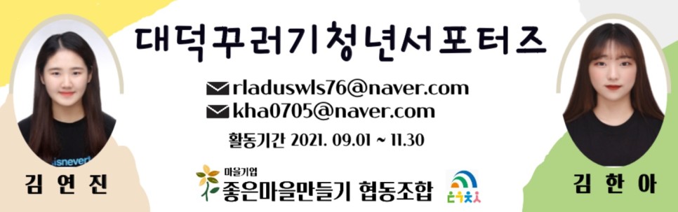 안녕하세요 :) 좋은마을만들기협동조합 '대덕꾸러기' 서포터즈 김연진, 김한아입니다