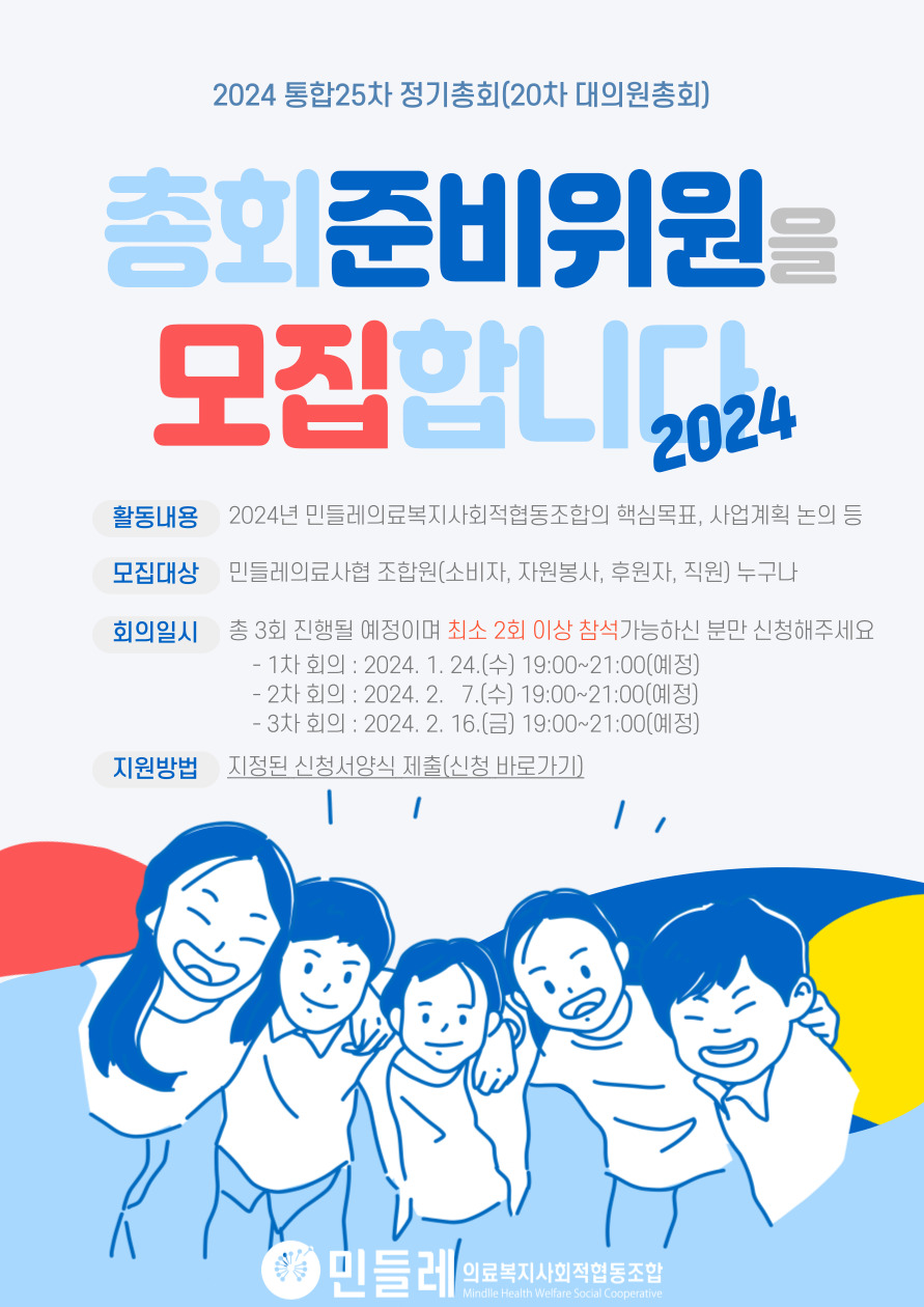 2024년 민들레의료복지사회적협동조합의 핵심목표, 사업계획 등을 함께 논의할 '총회준비위원'을 모집합니다. |