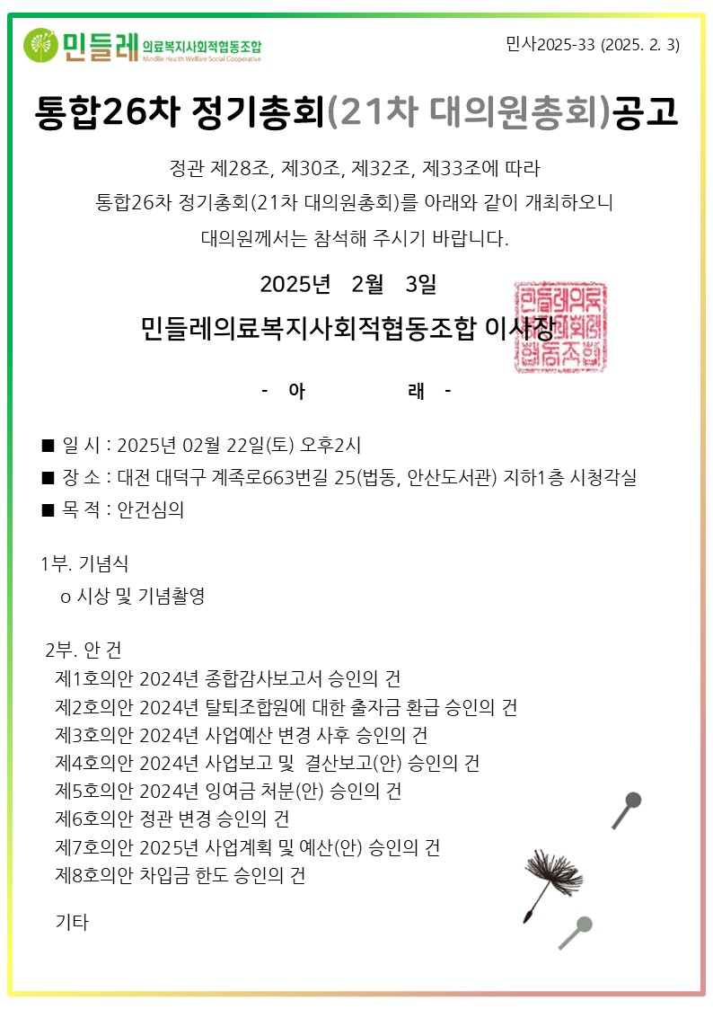 *대의원 총회는 위임이 되지 않습니다. 대의원님들은 꼭! 참석해 주세요 |