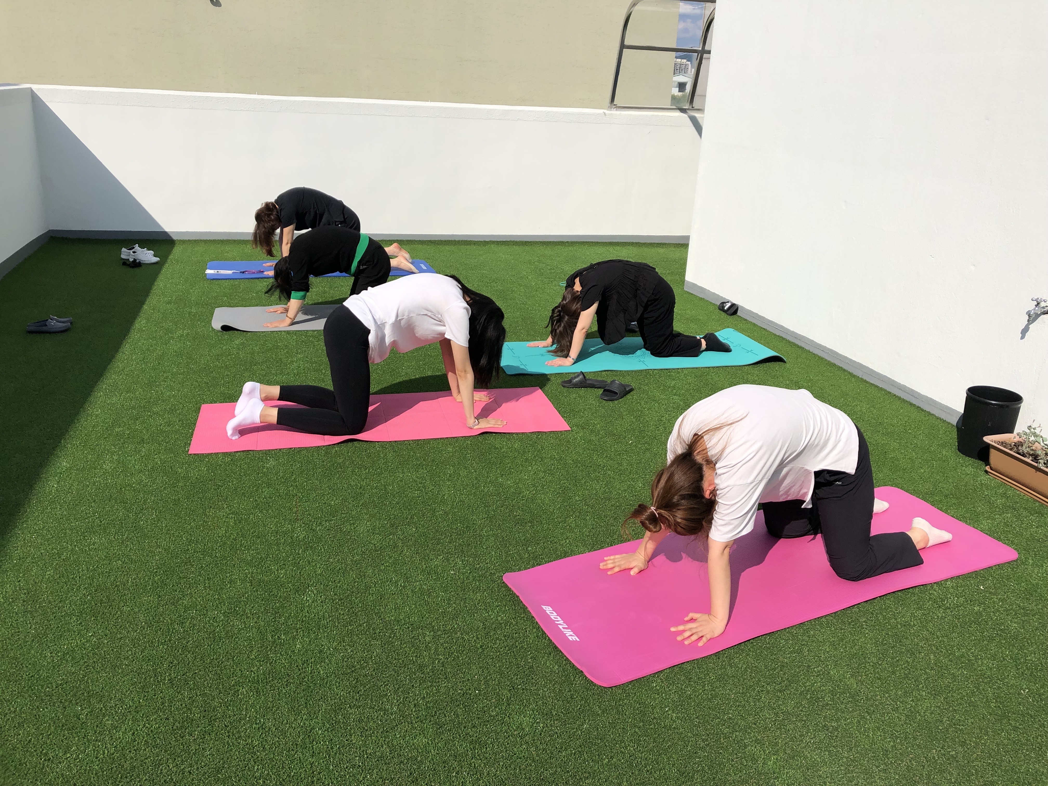 점심식사 후 옥상에 모여서 유하영 선생님의 지도로 고관절과 어깨를 스트레칭하고 코어근력을 기르는 운동자세를 배울 수 있었습니다. 각자 배운 자세를 연습하고 다시 만나기로 했습니다.
