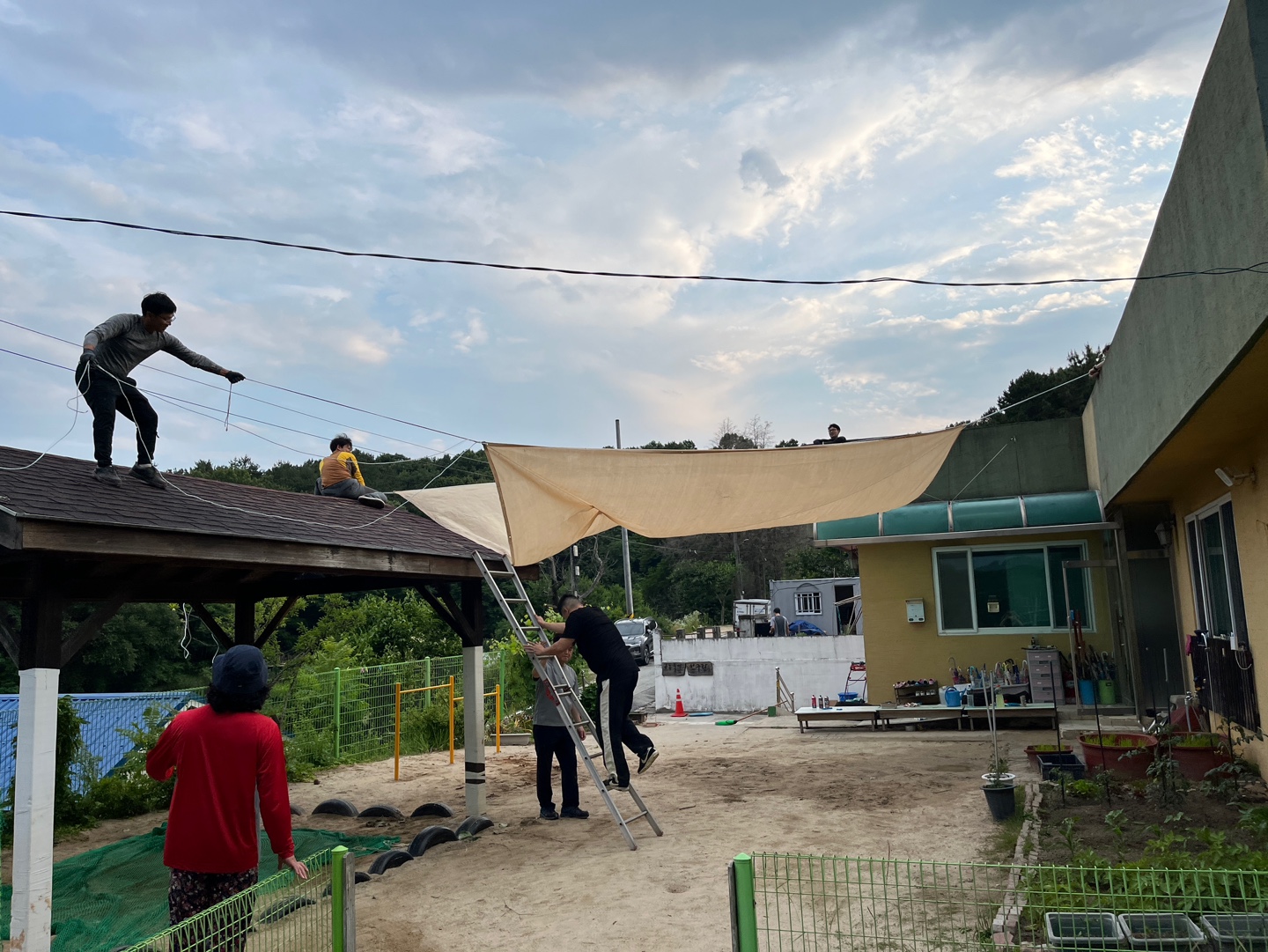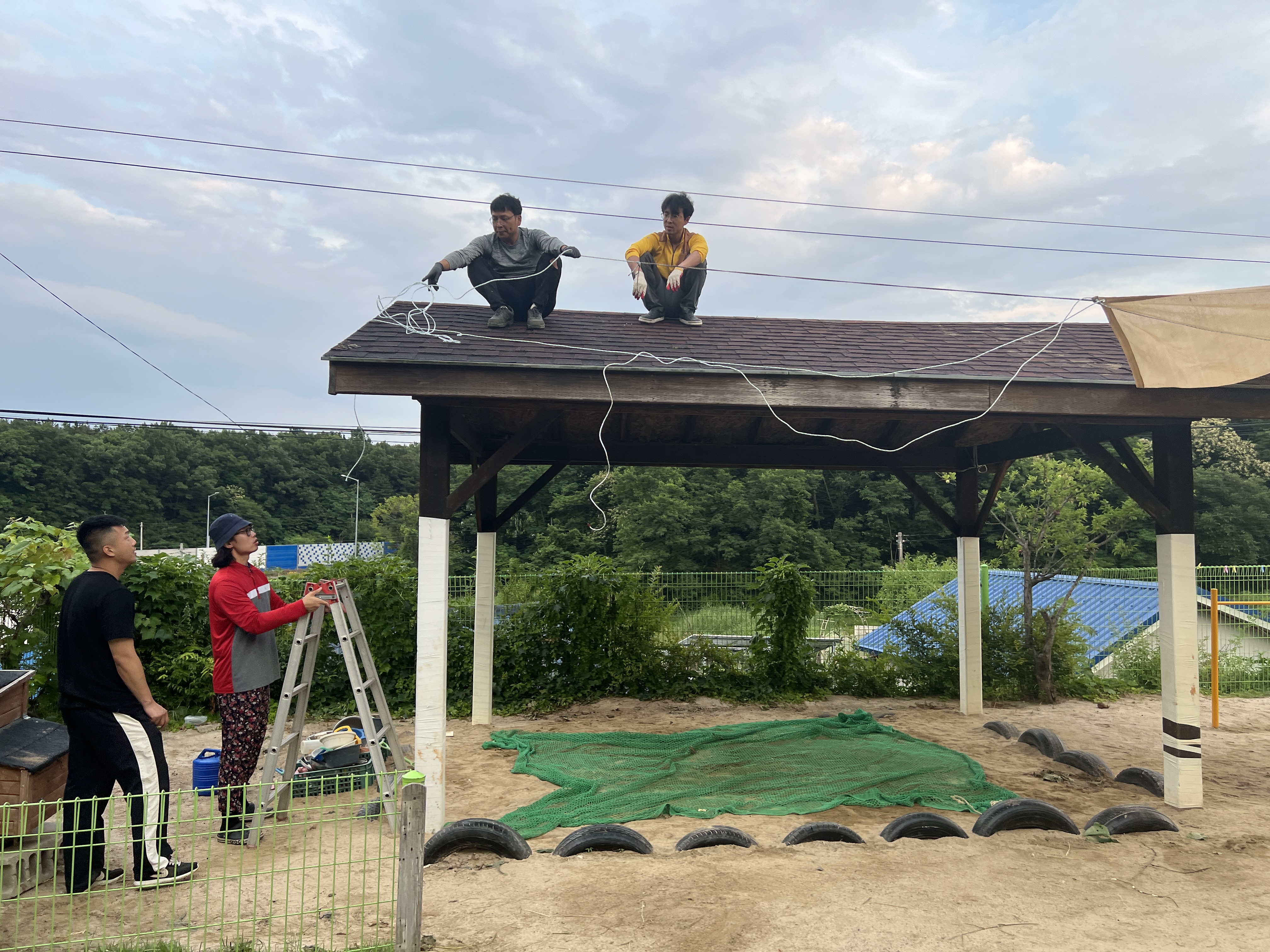 아이들이 다니는 어린이집을 방문하여 아빠들이 직접 그늘막 작업 실시. 무더운 여름 아이들의 그늘 놀이마당 확보와 아버님들의 움직임(노동)을 통해 건강증진에 기여.
